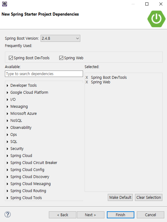 Web > Spring Boot DevTools, Spring Web를 선택 후 Finish