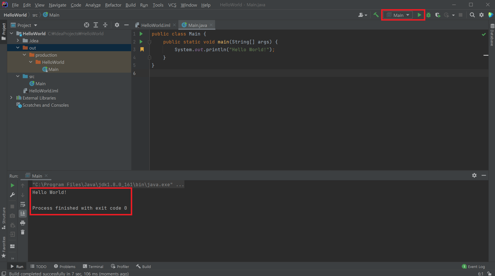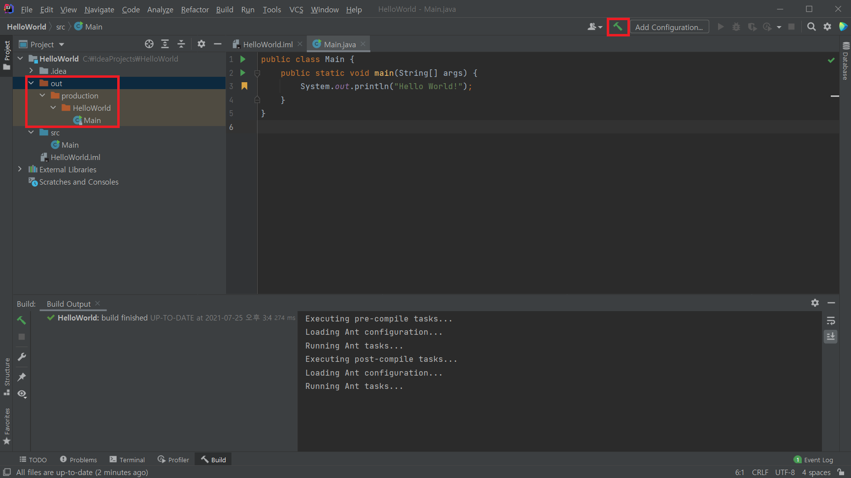 단축키 (ctrl + F9) 또는 상단 네비게이션 바의 망치 버튼을 클릭하면, out > production > HelloWorld > Main.class 파일이 생성된 것을 확인할 수 있습니다.