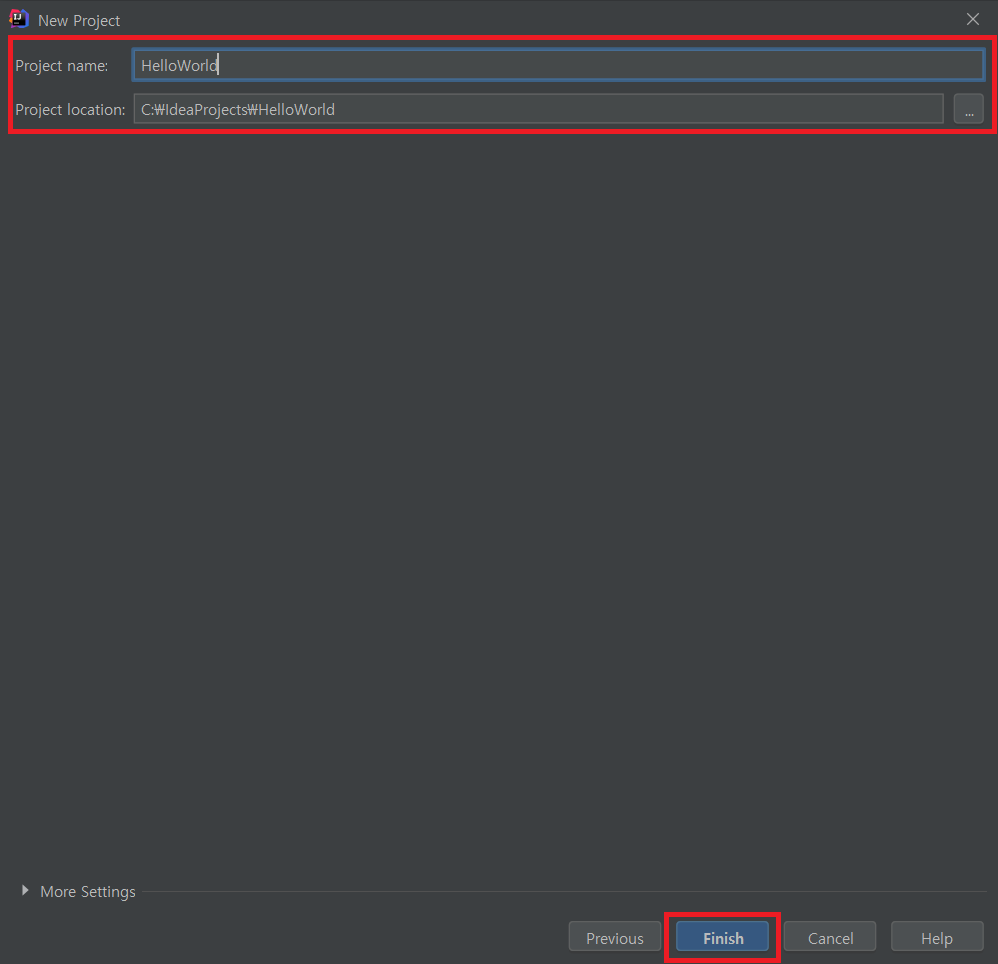 프로젝트명만 설정한 후 프로젝트 경로를 설정하지 않으면, /Users/[userName]/IdeaProjects/[ProjectName] 경로로 폴더가 생성됩니다.
