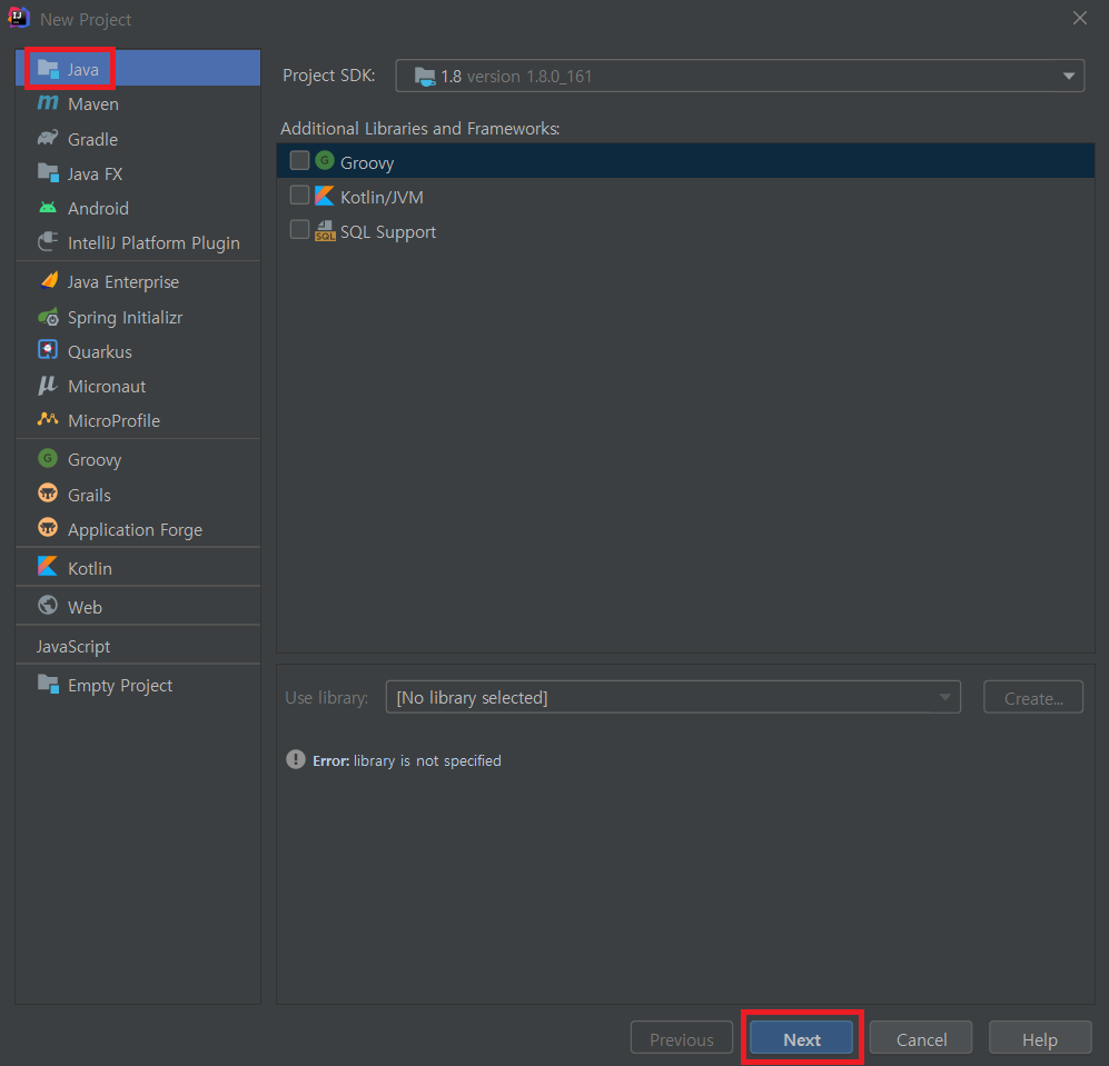 2. Java를 선택한 후 'Next' 버튼을 클릭