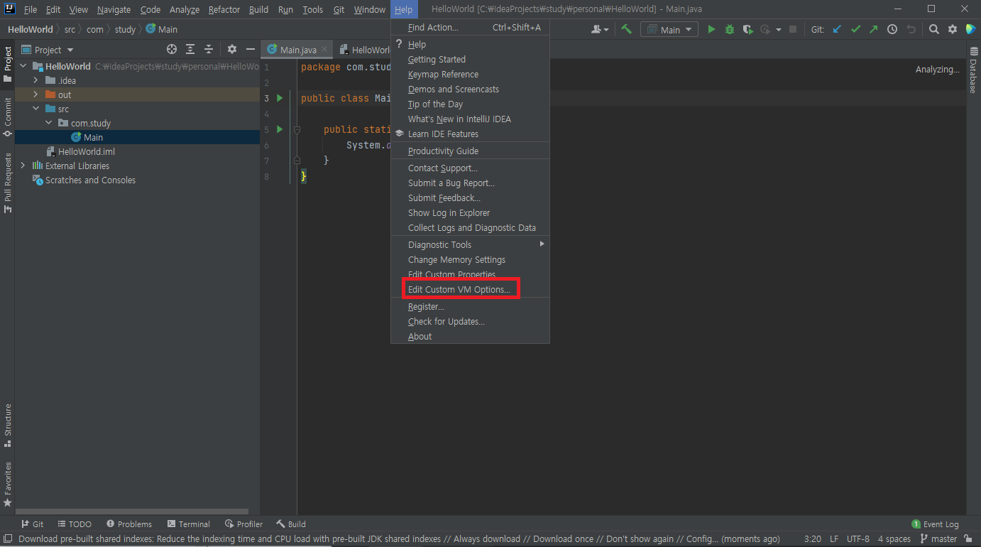 [IntelliJ] 프로젝트 GitHub에 연동하기(Share Project on GitHub) (0) 2021.07.28 [IntelliJ] Git 실행 파일 지정 및 GitHub 계정 연동 (0) 2021.07.27 [IntelliJ] 메모리(Memory) 설정(Maximum Heap Size, Show Memory Indicator) (0) 2021.07.27 [IntelliJ] 프로젝트 생성(Hello World 출력) (2) 2021.07.25 [IntelliJ] IntelliJ IDEA 다운로드 및 설치 (0) 2021.07.25