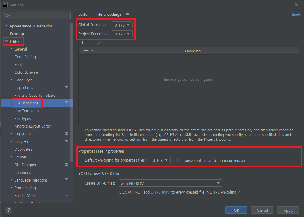 2. Editor > File Encodings - Global Encoding, Project Encoding, Properties Files을 UTF-8로 설정