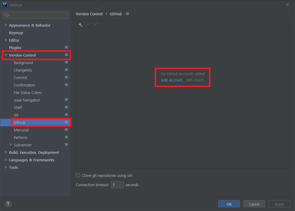 2_1. Settins(Ctrl + Alt + S) > Version Control > GitHub - Add Acount... 클릭