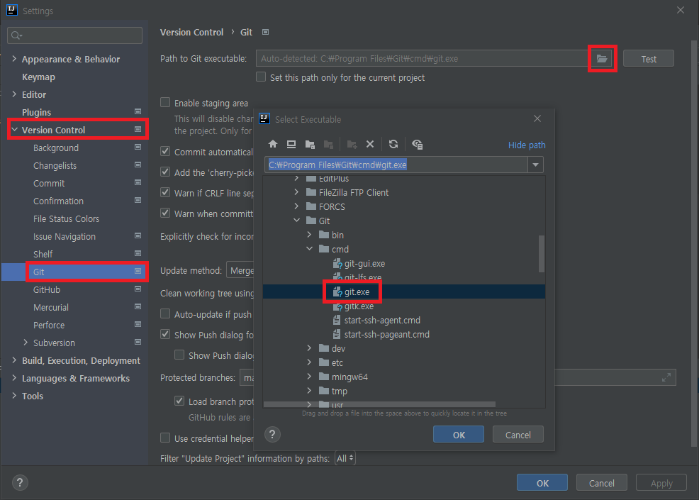 Settings...(Ctrl + Alt + S) > Version Control > Git - Git 실행 파일 경로를 지정