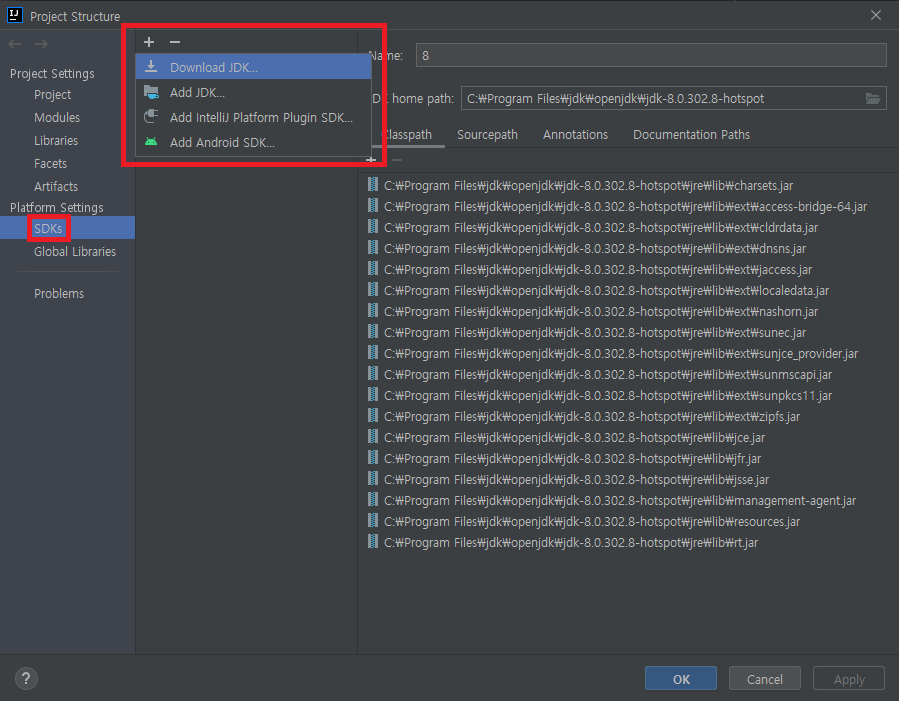 - Platform Settings > SDKs > '+' 버튼을 선택 > Add JDK... 선택