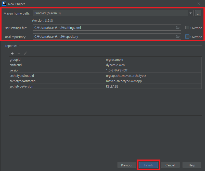 1_4. Maven 설정 -> Finish 버튼 클릭 (기본 설정값 변경하려면 Maven home directory를 변경)