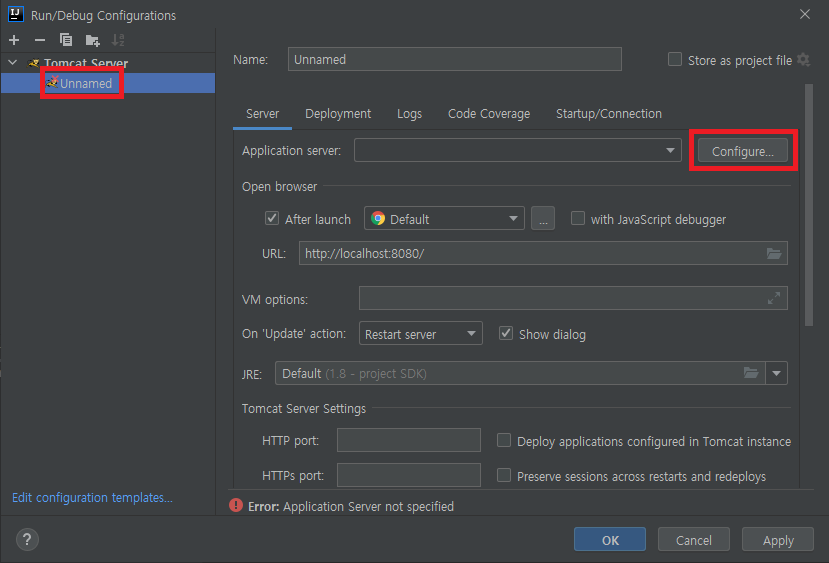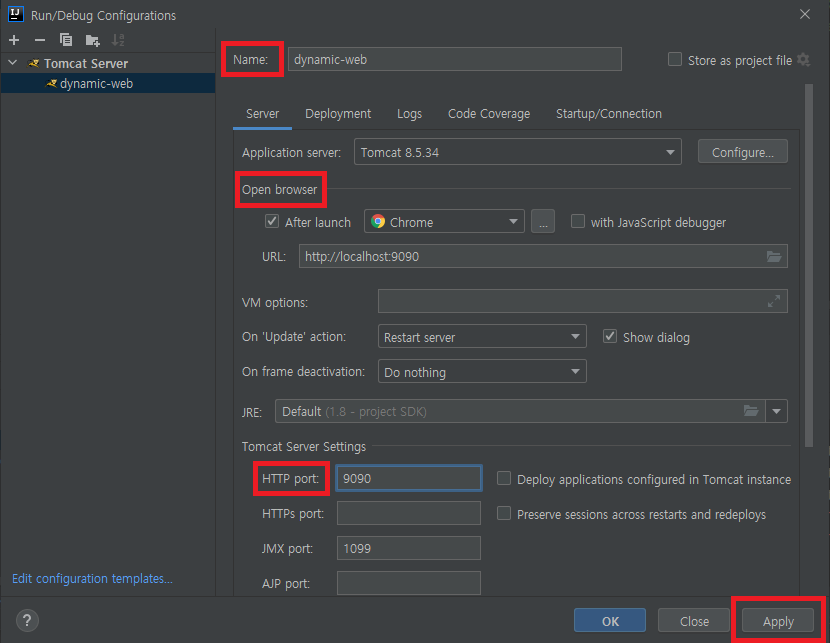 2_6. Server 탭 - 기본 설정값(Name, Open browser, HTTP port 등) 변경한 후 Apply 클릭