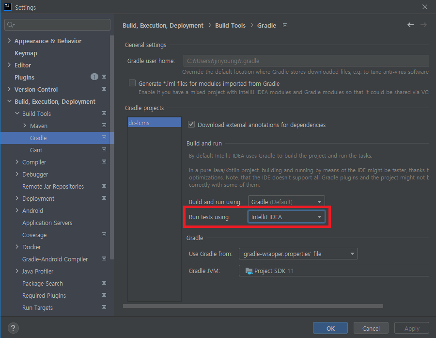 2. File > Settings...(Ctrl + Alt + S) > Build, Execution, Deployment -> Build Tools -> Gradle - Run tests using: IntelliJ IDEA를 선택