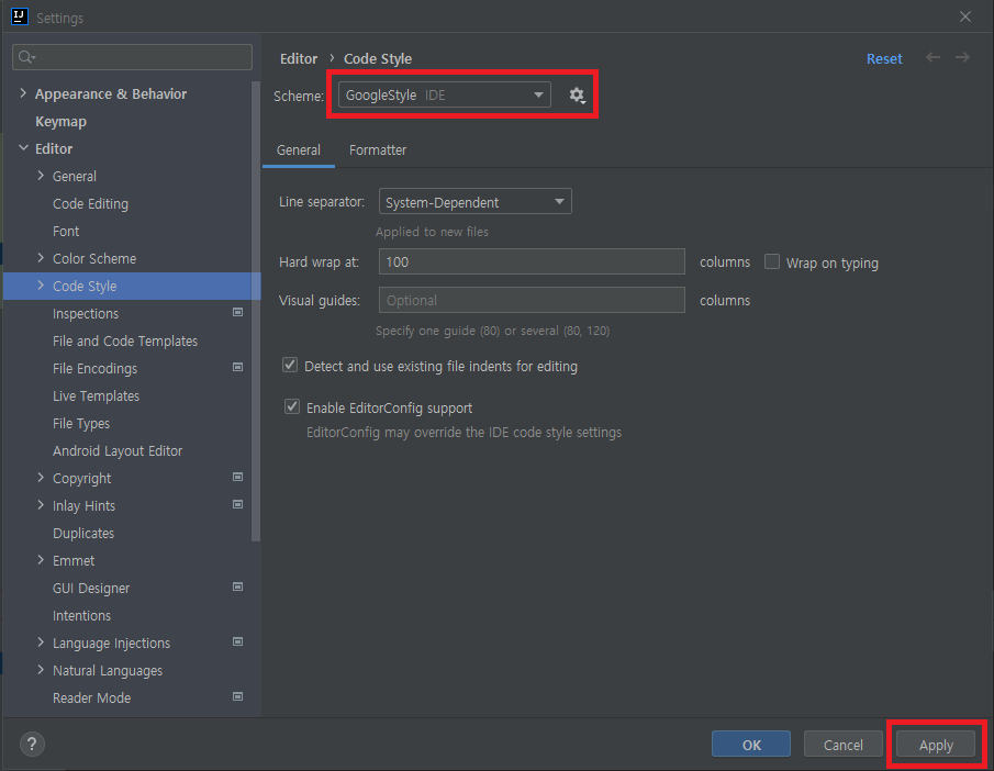 4. 적용한 Code Style을 확인한 후 Apply 버튼을 클릭
