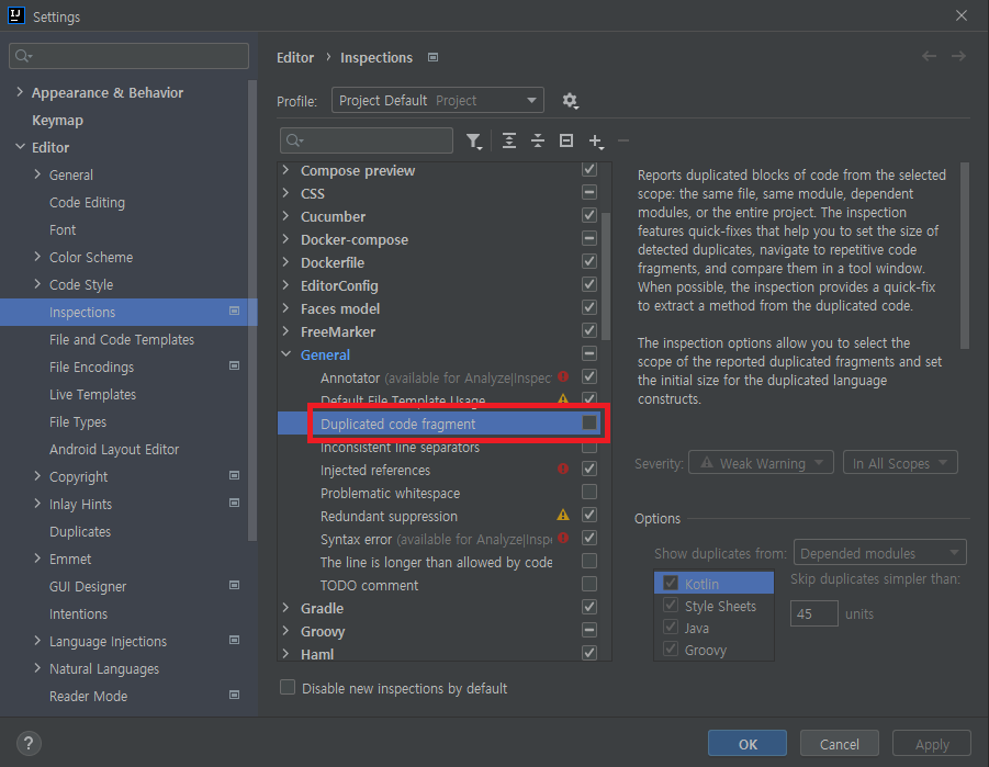 중복된 코드가 있을 경우 Found duplicated code in 이라는 노란줄이 볼 수 있는데, 노란줄을 제거하려면 다음과 같이 옵션을 설정