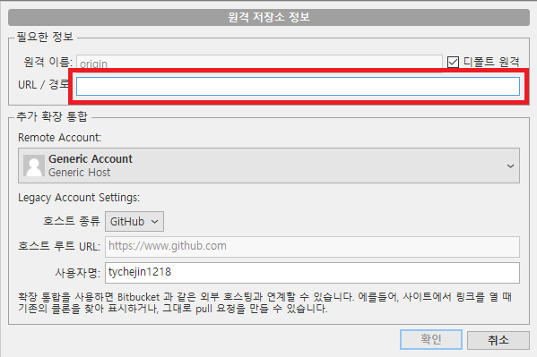 3. URL/경로를 다음과 같은 형식으로 수정- https://[ID]:[Access Token]@github.com/[ID]/[Repository].git