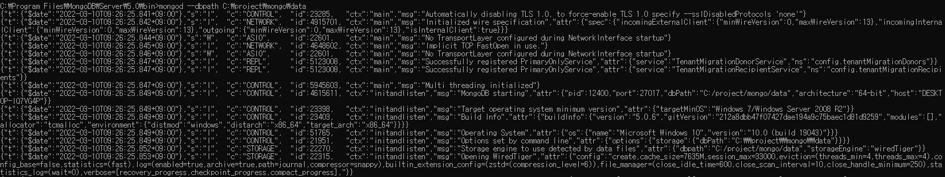 3_4. "mongod --dbpath <db경로>" 명령어을 입력 하여 정상적으로 서버가 실행되는지 확인