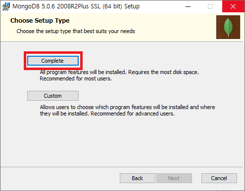 2_3. 기본 경로(C:\Program Files)에 설치하려면 'Complete' 버튼 클릭, 경로를 지정한 후 설치하려면 'Custom' 버튼 클릭