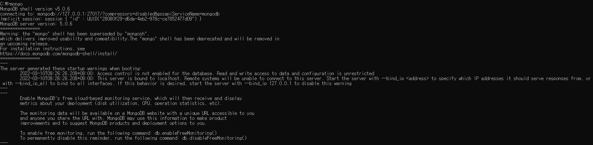 3_6. 서버가 실행된 경우 새로운 CMD(명령 프롬프트)창에서 "mongo" 명령어를 입력하여 클라이언트가 실행되는지 확인