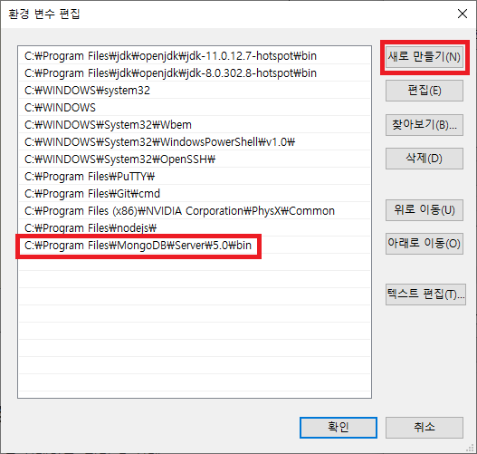 3_2. '새로 만들기'를 클릭하고, MongoDB의 bin 경로를 지정