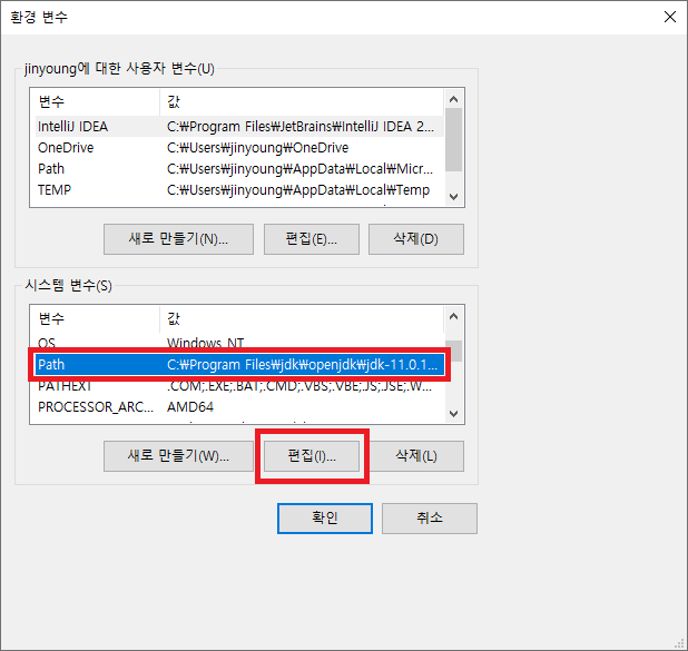 3_1. 시스템 변수의 'Path'를 선택하고 '편집'을 선택