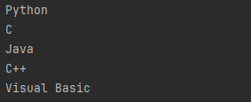 public static void createStreamBuilder() { Stream<String> stream = Stream.<String>builder() .add("Python") .add("C") .add("Java") .add("C++") .add("Visual Basic") .build(); stream.forEach(System.out::println); }Console Output