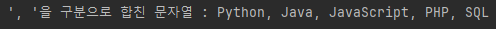 예제) 해당 스트림의 요소를 ', '을 기준으로 합쳐서 문자열로 반환public static void createStreamToString() { Stream<String> stream = Stream.of("Python", "Java", "JavaScript", "PHP", "SQL"); String result = stream.map(Object::toString).collect(Collectors.joining(", ")); System.out.println("', '을 구분으로 합친 문자열 : " + result); }Console Output