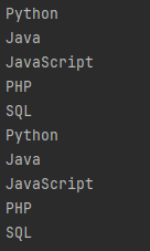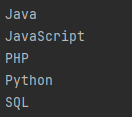 예제) 해당 스트림의 요소를 List 객체로 반환public static void createStreamToList() { Stream<String> stream = Stream.of( "Python", "Java", "JavaScript", "PHP", "SQL", "Python", "Java", "JavaScript", "PHP", "SQL" ); List<String> strings = stream.collect(Collectors.toList()); strings.forEach(System.out::println); }Console Output