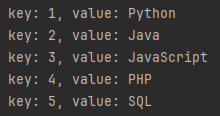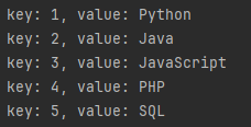 public static void createStreamToMap() { Stream<Language> languageStream = Stream.of( new Language(1, "Python"), new Language(2, "Java"), new Language(3, "JavaScript"), new Language(4, "PHP"), new Language(5, "SQL") ); Map<Integer, String> languageMap = languageStream.collect(Collectors.toMap(Language::getRank, Language::getLanguage)); languageMap.entrySet().forEach( (entry) -> System.out.println("key: " + entry.getKey() + ", value: " + entry.getValue()) ); }Console Output