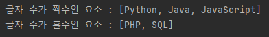 public static void createStreamToPartitioningBy() { Stream<String> stream = Stream.of("Python", "Java", "JavaScript", "PHP", "SQL"); Map<Boolean, List<String>> patition = stream.collect( Collectors.partitioningBy(s -> (s.length() % 2) == 0)); System.out.println("글자 수가 짝수인 요소 : " + patition.get(true)); System.out.println("글자 수가 홀수인 요소 : " + patition.get(false)); }Console Output