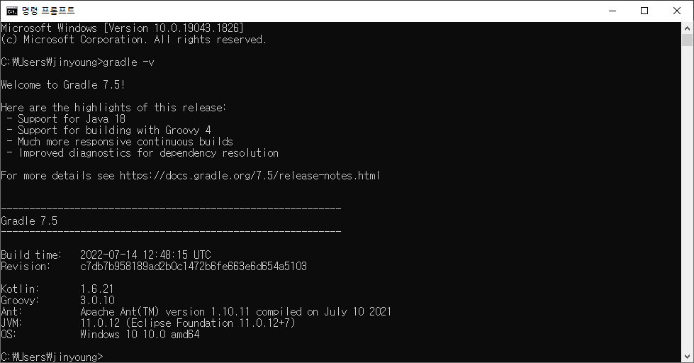 CMD 창에서 "gradle -v" 명령어를 입력하여 정상적으로 설치되었는지 확인하세요.