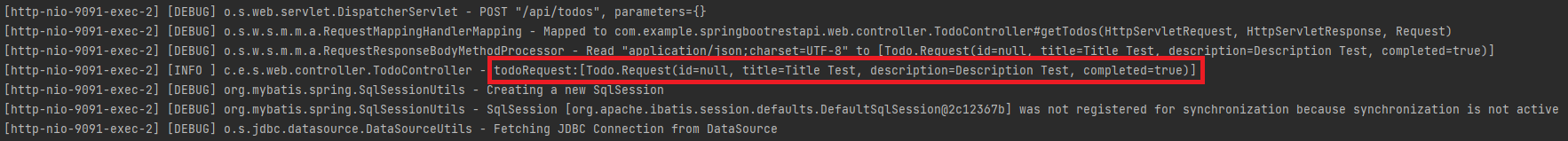 package com.example.springbootrestapi.web.controller; import com.example.springbootrestapi.domain.Todo; import com.example.springbootrestapi.service.TodoService; import java.util.List; import javax.servlet.http.HttpServletRequest; import javax.servlet.http.HttpServletResponse; import lombok.RequiredArgsConstructor; import lombok.extern.slf4j.Slf4j; import org.springframework.http.MediaType; import org.springframework.web.bind.annotation.PostMapping; import org.springframework.web.bind.annotation.RequestBody; import org.springframework.web.bind.annotation.RestController; @Slf4j @RequiredArgsConstructor @RestController public class TodoController { private final TodoService todoService; /** To-Do 조회 */ @PostMapping( value = "/api/todos", consumes = MediaType.APPLICATION_JSON_VALUE, produces = MediaType.APPLICATION_JSON_VALUE) public List<Todo.Response> getTodos( HttpServletRequest request, HttpServletResponse response, @RequestBody Todo.Request todoRequest) { log.info("todoRequest:[{}]", todoRequest.toString()); return todoService.getTodos(todoRequest); } }3. 로그 레벨