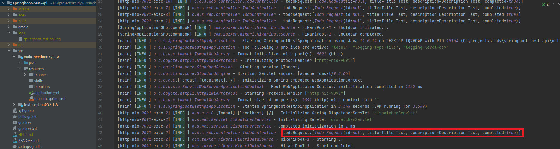 application.yml에서 설정한 spring.profiles를 변경하면서 로그를 확인하세요.6_1. spring.profiles.active가 local일 때 콘솔 화면에서 로그가 출력되는지 확인하세요.