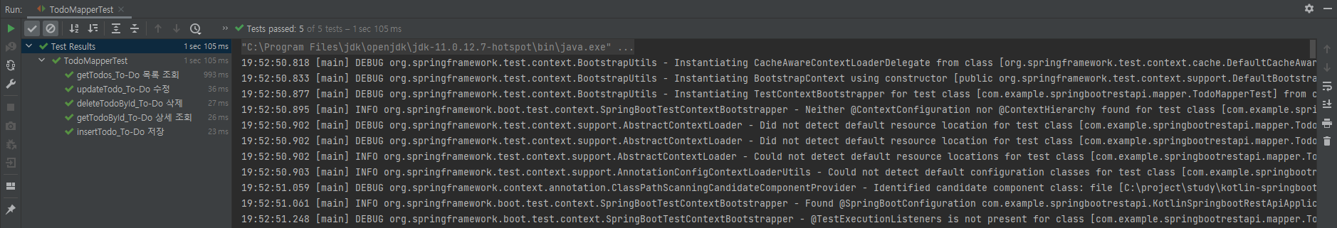 테스트 클래스 및 메서드의 이름을 지정할 수 있습니다.package com.example.springbootrestapi.mapper import com.example.springbootrestapi.domain.TodoRequest import org.junit.jupiter.api.Assertions import org.junit.jupiter.api.Assertions.assertEquals import org.junit.jupiter.api.Assertions.assertTrue import org.junit.jupiter.api.DisplayName import org.junit.jupiter.api.Test import org.springframework.beans.factory.annotation.Autowired import org.springframework.boot.test.context.SpringBootTest import org.springframework.test.context.ActiveProfiles import org.springframework.transaction.annotation.Transactional @SpringBootTest @ActiveProfiles("local") class TodoMapperTest { @Autowired lateinit var todoMapper: TodoMapper @Transactional @DisplayName("getTodos_To-Do 목록 조회") @Test fun testGetTodos() { // Given insertTodo("Title Junit Test Insert 01", "Description Junit Test Insert 01", false) insertTodo("Title Junit Test Insert 02", "Description Junit Test Insert 02", true) insertTodo("Title Junit Test Insert 03", "Description Junit Test Insert 03", false) insertTodo("Title Junit Test Insert 04", "Description Junit Test Insert 04", true) insertTodo("Title Junit Test Insert 05", "Description Junit Test Insert 05", false) var todoRequest = TodoRequest().apply { this.title = "Title Junit Test Insert" this.description = "Description Junit Test Insert" this.completed = true } // When var todos = todoMapper.getTodos(todoRequest) // Then assertTrue(!todos.isEmpty()) } @Transactional @DisplayName("getTodoById_To-Do 상세 조회") @Test fun testGetTodoById() { // Given var insertId = insertTodo("Title Junit Test Insert 01", "Description Junit Test Insert 01", false) // When var todoResponse = todoMapper.getTodoById(insertId) // Then assertEquals(insertId, todoResponse.id) } @Transactional @DisplayName("insertTodo_To-Do 저장") @Test fun testInsertTodo() { // Given var todoRequest = TodoRequest().apply { this.title = "Title Junit Test Insert" this.description = "Description Junit Test Insert" this.completed = false } // When todoMapper.insertTodo(todoRequest) // Then todoRequest.id?.let { var todoResponse = todoMapper.getTodoById(it) Assertions.assertEquals(todoRequest.title, todoResponse.title) Assertions.assertEquals(todoRequest.description, todoResponse.description) Assertions.assertEquals(todoRequest.completed, todoResponse.completed) } ?: throw Exception() } @Transactional @DisplayName("updateTodo_To-Do 수정") @Test fun testUpdateTodo() { // Given val insertId = insertTodo("Title Junit Test Insert", "Description Junit Test Insert", false) val todoRequest = TodoRequest().apply { this.id = insertId this.title = "Title Junit Test Update" this.description = "Description Junit Test Update" this.completed = true } // When todoMapper.updateTodo(todoRequest) // Then todoRequest.id?.let { var todoResponse = todoMapper.getTodoById(it) Assertions.assertEquals(todoRequest.title, todoResponse.title) Assertions.assertEquals(todoRequest.description, todoResponse.description) Assertions.assertEquals(todoRequest.completed, todoResponse.completed) } ?: throw Exception() } @Transactional @DisplayName("deleteTodoById_To-Do 삭제") @Test fun testDeleteTodoById() { // Given val insertId = insertTodo("Title Junit Test Insert", "Description Junit Test Insert", false) // When todoMapper.deleteTodoById(insertId) // Then val todoResponse = todoMapper.getTodoById(insertId) Assertions.assertNull(todoResponse) } fun insertTodo( title: String, description: String, completed: Boolean ): Long { var todoRequest = TodoRequest().apply { this.title = title this.description = description this.completed = completed } todoMapper.insertTodo(todoRequest) return todoRequest.id ?: 0 } }4. 단위 테스트 확인