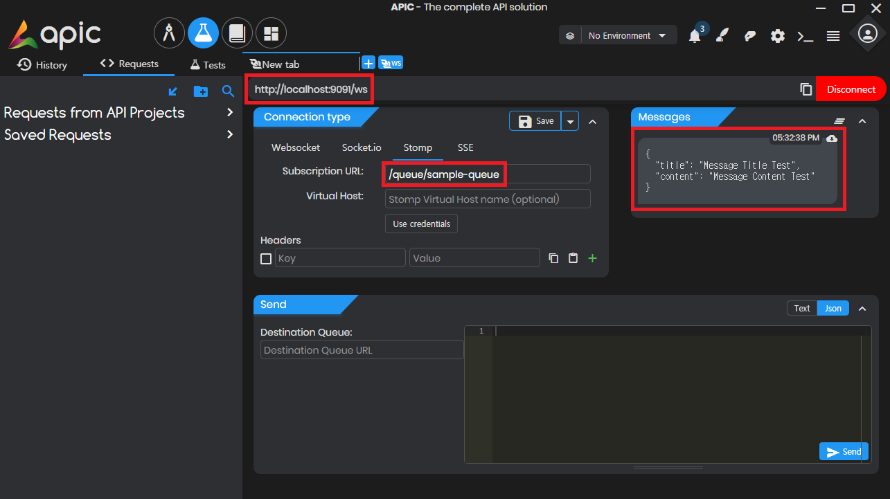 APIC을 사용하여 WebSocket을 통한 STOMP를 테스트할 수 있습니다.