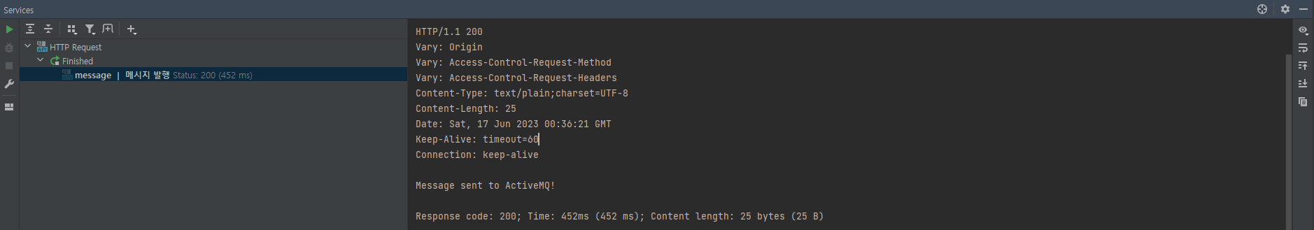 MessageController.javapackage com.example.activemq.contoller; import com.example.activemq.dto.MessageDto; import com.example.activemq.service.MessageService; import lombok.RequiredArgsConstructor; import lombok.extern.slf4j.Slf4j; import org.springframework.http.ResponseEntity; import org.springframework.web.bind.annotation.CrossOrigin; import org.springframework.web.bind.annotation.RequestBody; import org.springframework.web.bind.annotation.RequestMapping; import org.springframework.web.bind.annotation.RequestMethod; import org.springframework.web.bind.annotation.RestController; @Slf4j @RequiredArgsConstructor @RestController public class MessageController { private final MessageService messageService; /** * Queue로 메시지를 발행 * * @param messageDto 발행할 메시지의 DTO 객체 * @return ResponseEntity 객체로 응답을 반환 */ @CrossOrigin @RequestMapping(value = "/send/message", method = RequestMethod.POST) public ResponseEntity<?> sendMessage(@RequestBody MessageDto messageDto) { messageService.sendMessage(messageDto); return ResponseEntity.ok("Message sent to ActiveMQ!"); } }7. 메시지 발행 확인