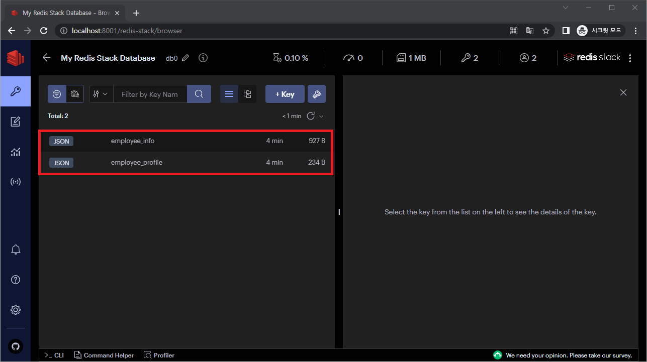 package com.example.redisjson.dto; import java.util.List; import lombok.AllArgsConstructor; import lombok.Builder; import lombok.Getter; import lombok.NoArgsConstructor; import lombok.Setter; @Getter @Setter @Builder public class EmployeeDto { List<Info> employees; @Getter @Setter @Builder @NoArgsConstructor @AllArgsConstructor public static class Info { private String name; private String email; private int age; } }7. 저장 및 조회 확인