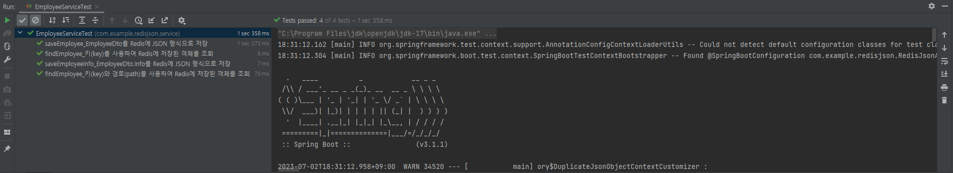 package com.example.jedissample.service; import static org.junit.jupiter.api.Assertions.assertFalse; import com.example.jedissample.dto.EmployeeDto; import com.fasterxml.jackson.databind.ObjectMapper; import java.util.ArrayList; import java.util.List; import lombok.extern.slf4j.Slf4j; import org.junit.jupiter.api.DisplayName; import org.junit.jupiter.api.Test; import org.springframework.beans.factory.annotation.Autowired; import org.springframework.boot.test.context.SpringBootTest; import org.springframework.util.ObjectUtils; @Slf4j @SpringBootTest class EmployeeServiceTest { @Autowired private EmployeeService employeeService; @Autowired private ObjectMapper objectMapper; @DisplayName("saveEmployeeInfo_EmployeeDto.Info를 Redis에 JSON 형식으로 저장") @Test void testSaveEmployeeInfo() throws Exception { // Given String key = "employee_profile"; EmployeeDto.Info employeeInfo = EmployeeDto.Info.builder() .name("Paul John") .email("paul.john@example.com") .age(42) .build(); // When EmployeeDto.Info responseEmployeeInfo = employeeService.saveEmployeeInfo(key, employeeInfo); // Then log.debug("responseEmployeeInfo: {}", objectMapper.writeValueAsString(responseEmployeeInfo)); assertFalse(ObjectUtils.isEmpty(responseEmployeeInfo)); } @DisplayName("saveEmployee_EmployeeDto를 Redis에 JSON 형식으로 저장") @Test void testSaveEmployee() throws Exception { // Given String key = "employee_info"; List<EmployeeDto.Info> employees = new ArrayList<>(); employees.add(EmployeeDto.Info.builder() .name("Alpha") .email("alpha@gmail.com") .age(23) .build()); employees.add(EmployeeDto.Info.builder() .name("Beta") .email("beta@gmail.com") .age(28) .build()); employees.add(EmployeeDto.Info.builder() .name("Gamma") .email("gamma@gmail.com") .age(33) .build()); employees.add(EmployeeDto.Info.builder() .name("Theta") .email("theta@gmail.com") .age(41) .build()); EmployeeDto employee = EmployeeDto.builder() .employees(employees) .build(); // When EmployeeDto responseEmployee = employeeService.saveEmployee(key, employee); // Then log.debug("responseEmployee: {}", objectMapper.writeValueAsString(responseEmployee)); assertFalse(ObjectUtils.isEmpty(responseEmployee)); } @DisplayName("findEmployee_키(key)를 사용하여 Redis에 저장된 객체를 조회") @Test void testFindEmployee() throws Exception { // Given String key = "employee_info"; // When EmployeeDto responseEmployee = employeeService.findEmployee(key); // Then log.debug("responseEmployee: {}", objectMapper.writeValueAsString(responseEmployee)); assertFalse(ObjectUtils.isEmpty(responseEmployee)); } @DisplayName("findEmployee_키(key)와 경로(path)를 사용하여 Redis에 저장된 객체를 조회") @Test void testFindEmployeePath() throws Exception { // Given String key = "employee_info"; String path = "$.employees[?(@.age>20&&@.age<40)]"; // When List<EmployeeDto.Info> responseEmployee = employeeService.findEmployee(key, path); // Then log.debug("responseEmployee: {}", objectMapper.writeValueAsString(responseEmployee)); assertFalse(ObjectUtils.isEmpty(responseEmployee)); } }8. 콘솔 확인