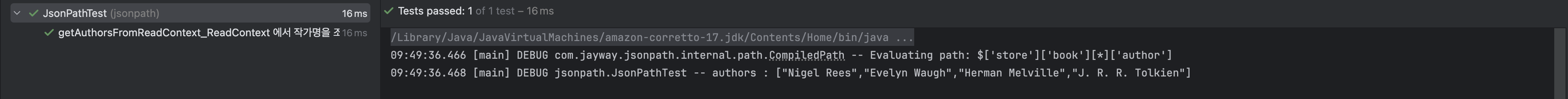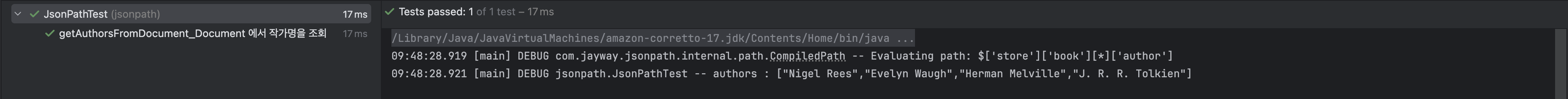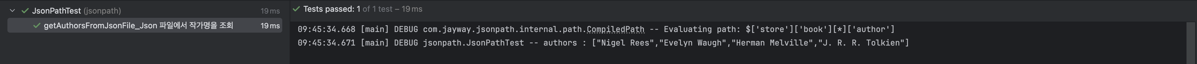 3_3. ReadContext 객체를 이용하여 JSONPath를 통한 작가명 추출@DisplayName("getAuthorsFromReadContext_ReadContext 에서 작가명을 조회") @Test void testGetAuthorsFromReadContext() { // Given // JSON 문자열을 ReadContext 객체로 파싱 ReadContext readContext = JsonPath.parse(json); // When // JSONPath를 사용하여 ReadContext 객체에서 작가명을 추출 List<String> authors = readContext.read("$.store.book[*].author"); log.debug("authors : {}", authors); // Then assertAll( () -> assertFalse(authors.isEmpty()) ); }