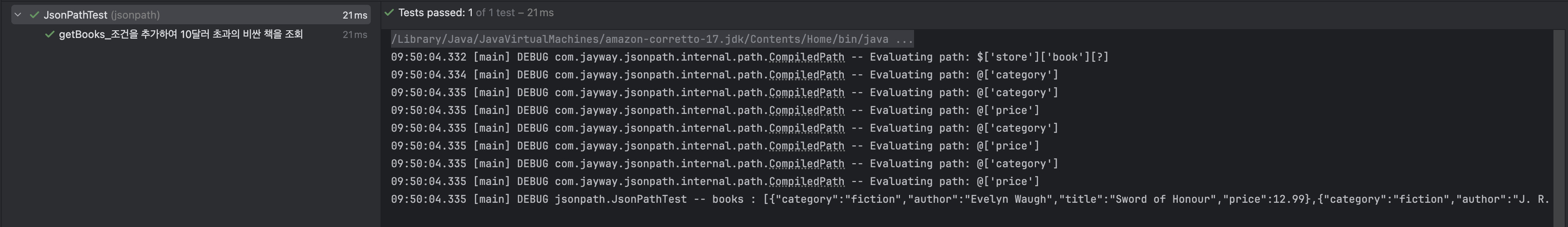 $.store.book[?(@.category == 'fiction' && @.price > 10)] 표현식은 book 배열 내에서 category가 'fiction'이고 price가 10달러를 초과하는 책 객체들을 반환합니다.@DisplayName("getBooks_조건을 추가하여 10달러 초과의 비싼 책을 조회") @Test void testGetBooks() { // Given & When // JSONPath를 사용하여 조건에 따라 책 정보를 추출 List<Map<String, Object>> books = JsonPath .using(Configuration.defaultConfiguration()) .parse(json) .read("$.store.book[?(@.category == 'fiction' && @.price > 10)]", List.class); log.debug("books : {}", books); // Then assertAll( () -> assertFalse(books.isEmpty()) ); }