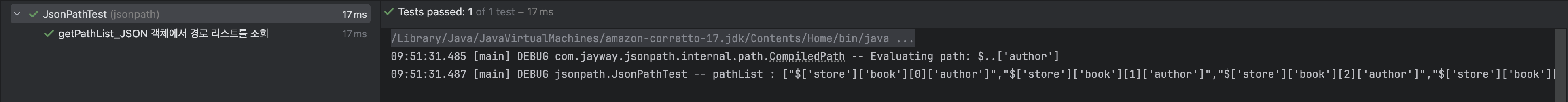 Option.AS_PATH_LIST 옵션을 사용하여 JSON 데이터에서 모든 경로 리스트를 추출하고 이를 검증합니다.@DisplayName("getPathList_JSON 객체에서 경로 리스트를 조회") @Test void testGetPathList() { // Given // Option.AS_PATH_LIST는 JsonPath 표현식에 매칭되는 모든 경로를 리스트의 형태로 반환 Configuration conf = Configuration.builder() .options(Option.AS_PATH_LIST) .build(); String jsonPath = "$..author"; List<String> expectedPathList = Arrays.asList( "$['store']['book'][0]['author']", "$['store']['book'][1]['author']", "$['store']['book'][2]['author']", "$['store']['book'][3]['author']"); // When // 경로 리스트를 추출 List<String> pathList = JsonPath .using(conf) .parse(json) .read(jsonPath); log.debug("pathList : {}", pathList); // Then assertAll( () -> assertFalse(pathList.isEmpty()), () -> assertArrayEquals(expectedPathList.toArray(), pathList.toArray()) ); }