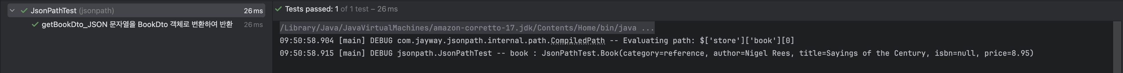 JSONPath를 사용하여 첫 번째 책의 정보를 Book 객체로 변환하고 이를 검증합니다.@DisplayName("getBookDto_JSON 문자열을 BookDto 객체로 변환하여 반환") @Test void testGetBook() { // Given String jsonPath = "$.store.book[0]"; // When // JSON 문자열을 Book 객체로 변환 Book book = JsonPath.parse(json).read(jsonPath, Book.class); log.debug("book : {}", book.toString()); // Then assertAll( () -> assertNotNull(book), () -> assertEquals("reference", book.getCategory()), () -> assertEquals("Nigel Rees", book.getAuthor()), () -> assertEquals("Sayings of the Century", book.getTitle()), () -> assertEquals(8.95, book.getPrice()) ); }