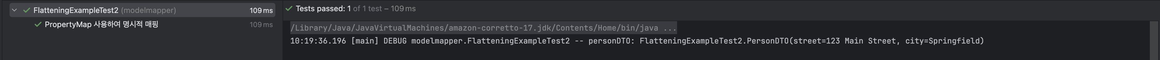 PropertyMap을 사용하여 명시적으로 매핑을 설정하는 예제입니다.@DisplayName("PropertyMap 사용하여 명시적 매핑") @Test void testUsingPropertyMap() { // Given Address address = Address.builder() .street("123 Main Street") .city("Springfield") .build(); Person person = Person.builder() .address(address) .build(); // PropertyMap을 사용하여 명시적 매핑 설정 PropertyMap<Person, PersonDTO> personMap = new PropertyMap<>() { protected void configure() { // Address 객체의 street 속성을 PersonDTO 객체의 street 속성에 매핑 map().setStreet(source.getAddress().getStreet()); // Address 객체의 city 속성을 PersonDTO 객체의 city 속성에 매핑 map(source.getAddress().getCity(), destination.getCity()); } }; // PropertyMap 추가 modelMapper.addMappings(personMap); // When // Person 객체를 PersonDTO 객체로 변환 PersonDTO personDTO = modelMapper.map(person, PersonDTO.class); log.debug("personDTO: {}", personDTO); // Then assertAll( () -> assertEquals(address.getStreet(), personDTO.getStreet()), () -> assertEquals(address.getCity(), personDTO.getCity()) ); }