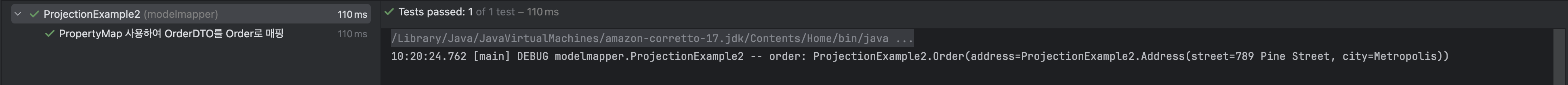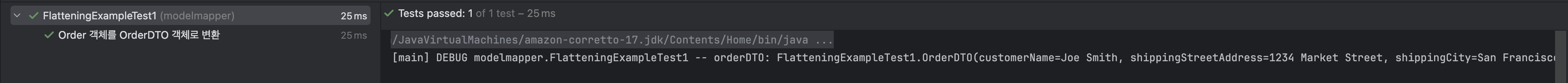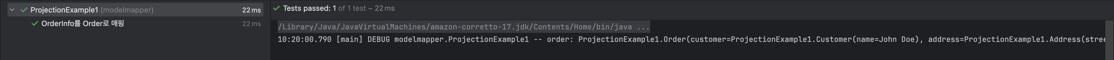 단순한 객체 OrderInfo를 복잡한 객체 Order로 변환하는 예제입니다.@DisplayName("OrderInfo를 Order로 매핑") @Test void testOrderInfoToOrderMapping() { // Given OrderInfo orderInfo = OrderInfo.builder() .customerName("John Doe") .streetAddress("456 Elm Street") .build(); // When // OrderInfo 객체를 Order 객체로 변환 Order order = modelMapper.map(orderInfo, Order.class); log.debug("order: {}", order); // Then assertAll( () -> assertEquals(orderInfo.getCustomerName(), order.getCustomer().getName()), () -> assertEquals(orderInfo.getStreetAddress(), order.getAddress().getStreet()) ); }